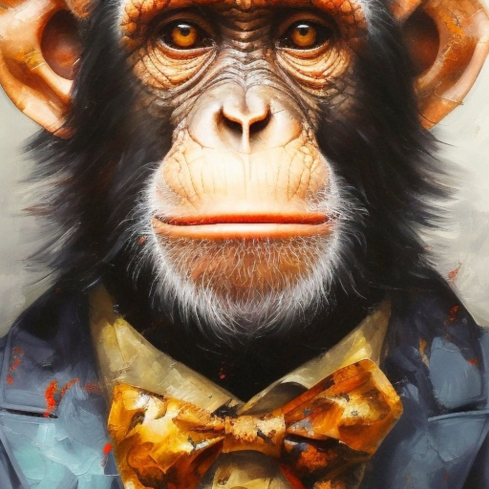 About "monkey chimpanzee portrait suit bow tie human surreal"