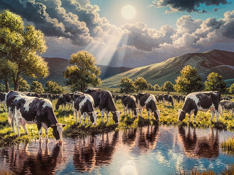 A mountain landscape with cows drinking at a pond in sunny weather. The mirror image of the cows and the sun is then also reflected in the water.