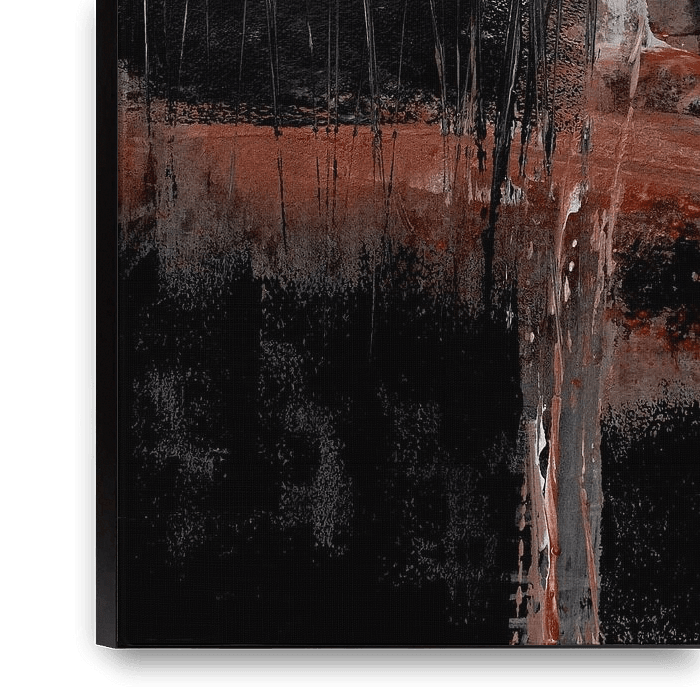 This abstract painting features a dramatic interplay of dark black tones, warm copper hues, and subtle gray highlights. The textured surface showcases a harmonious blend of bold and delicate brushstrokes, creating depth and movement within the composition. Layers of copper and rust-like accents provide warmth and contrast against the…