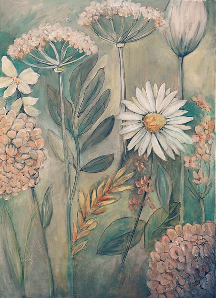 An acrylic painting of a random assortment of flowers and leaves, rendered in a somewhat naive, ‘ "’ style, with colours kept soft and retro. The daisy really stands out...