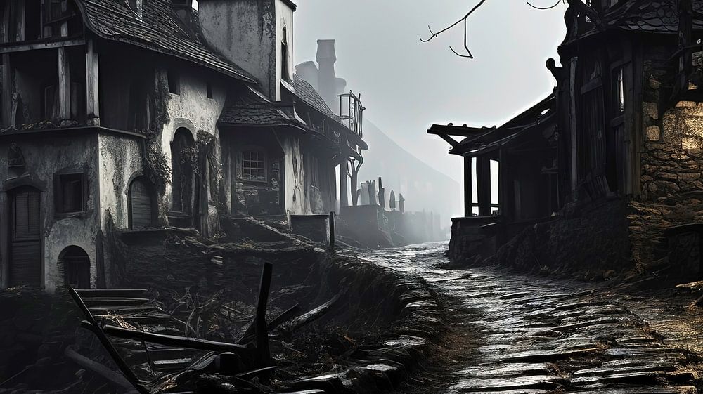 Old dark buildings rise like witnesses to a past glory, their facades laced with the web of time. The stones bear scars of centuries, telling stories of triumphs and tragedies whispered by the wind blowing through the deserted corridors. Towers rise proudly above the landscape, like spires of wistful memories.