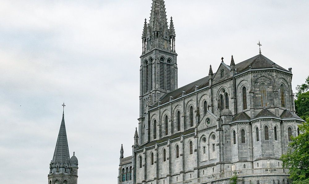 Lourdes, France, 08-june-2025: many pilgrims visiting the Sanctuary of Our Lady of Lourdes on a beautiful spring day, Europe