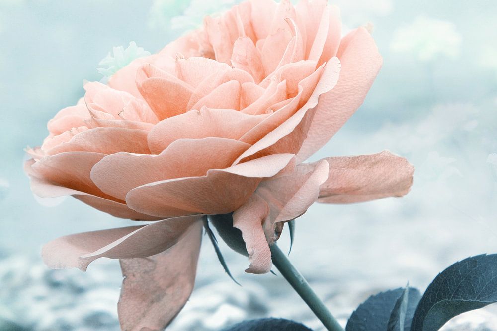 one orange rose flower at the stony beach, soft water background. floral texture turquoise