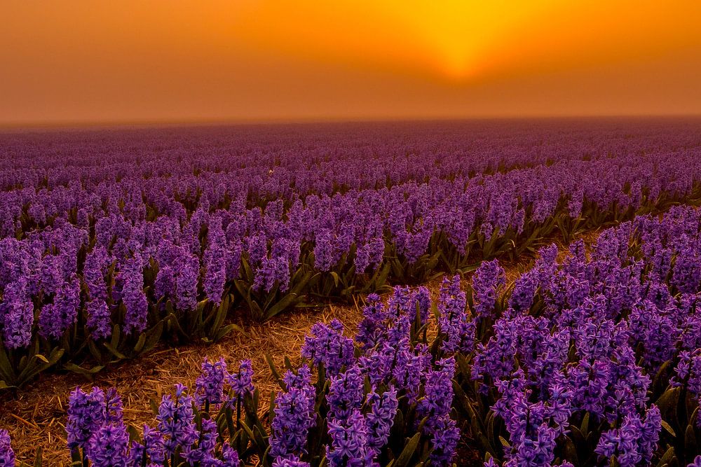 Hyacinth field along the A9 at Heiloo with some windmills in the Boelermeer in the background.