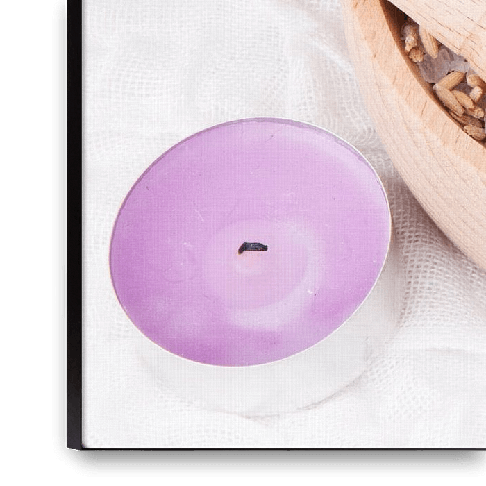 Paarse lavendel spa setting met hotstones, kaars en badzout