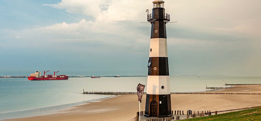 Unique view from the dike at Breskens of the lighthouse and the Westerschelde with shipping. On the other side the contours of Vlissingen. An approaching thunderstorm is gathering its clouds above Breskens and will soon break loose, while in Vlissingen it is still blue....