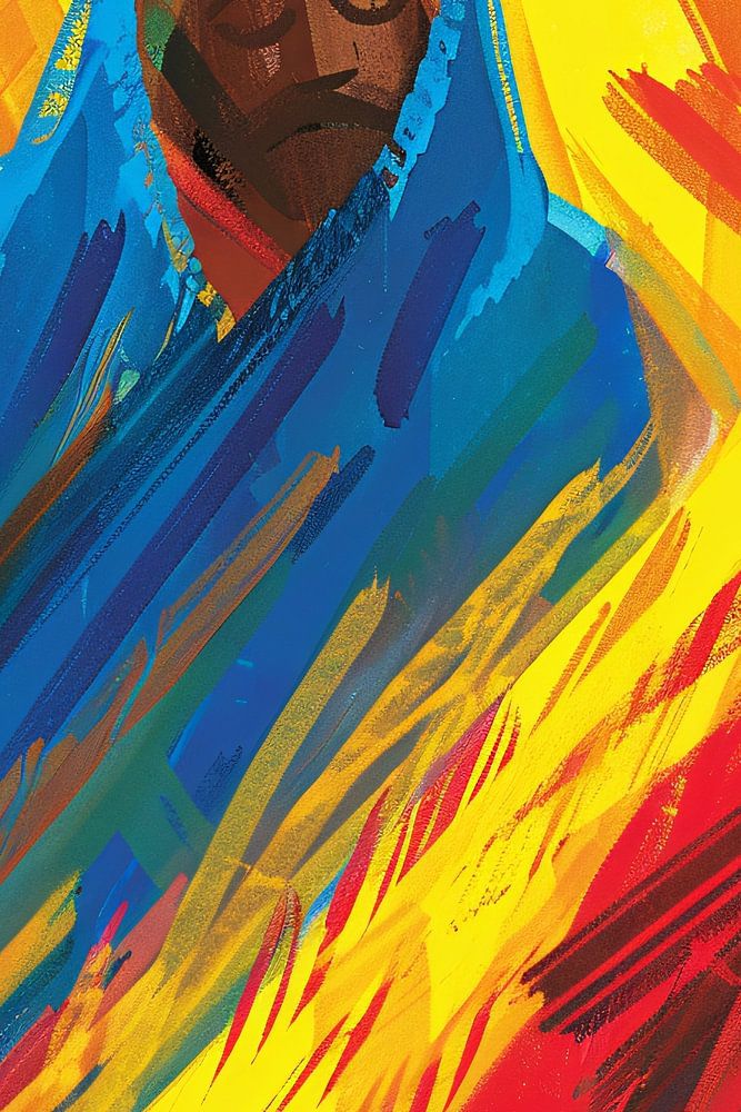This abstract masterpiece captures the essence of human emotion in an explosion of colours. The bright hues of yellow, orange and red dance like flames around a mysterious figure enveloped in a cool blue cloak. It seems as if the person's soul is about to break free from the canvas, driven by an invisible force. This artwork is a powerful statement that fills any space with energy and intrigue.