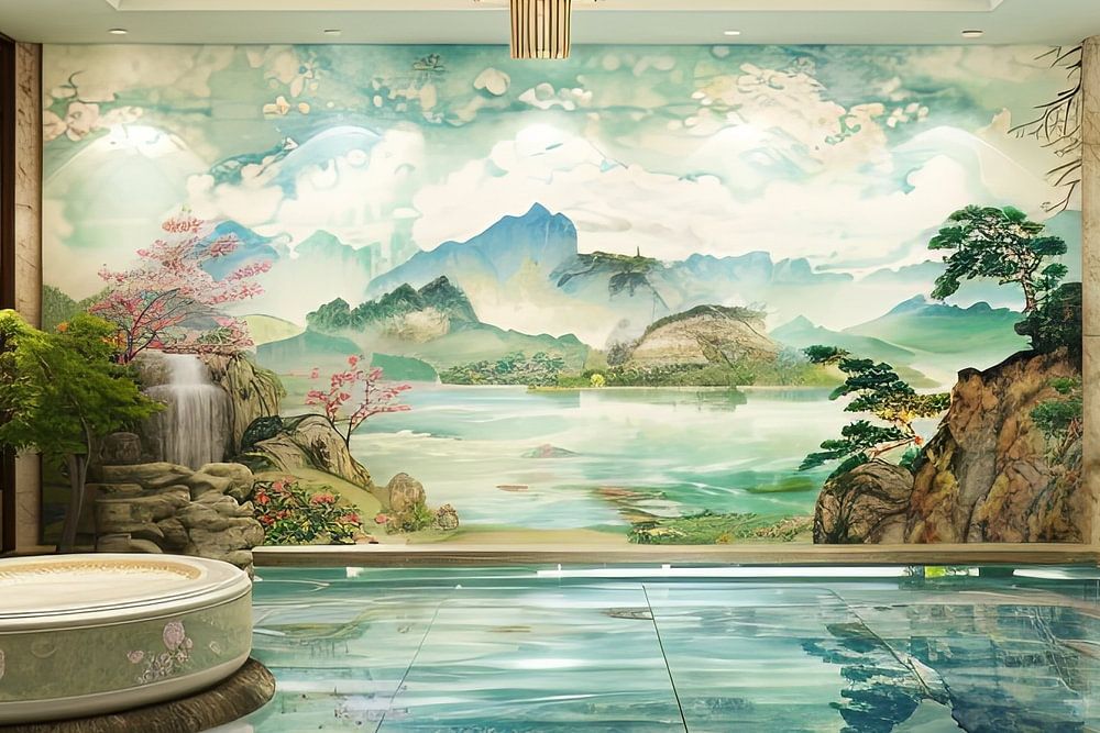 Buy this landscape artwork picturesque Japan spa hot spa by Egon Zitter on canvas, ArtFrame, poster and wallpaper, printed on demand in high quality.