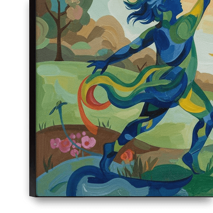 This vibrant painting captures a joyful and imaginative scene of a child flying a colorful kite in a lively natural landscape. The child is depicted in flowing, abstract shapes with shades of blue, green, and yellow, giving a sense of motion and freedom. With one arm stretched high, they hold the kite string as the wind lifts it into…