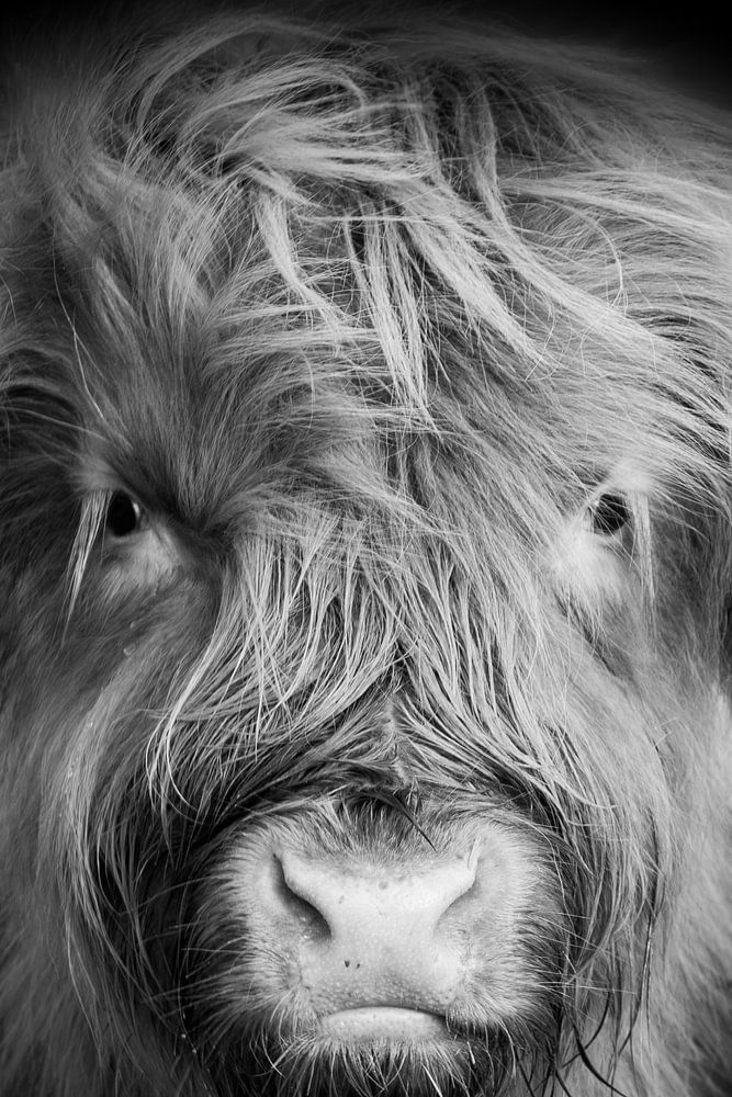 About "portrait Scottish highlander, higlander cow, black and white photography"