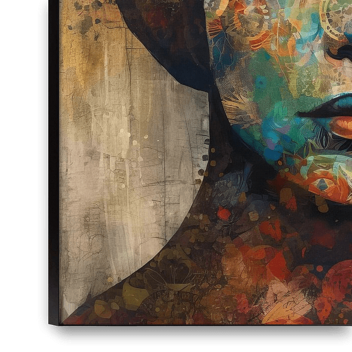 This artwork is a portrait of a woman, her face peacefully closed eyes, composed of a mosaic of warm, vibrant hues and complex patterns reminiscent of mechanical gears and organic shapes. The texture resembles weathered parchment, giving a timeless quality to the image. This face is a fabric of history and stories, each pattern an echo…