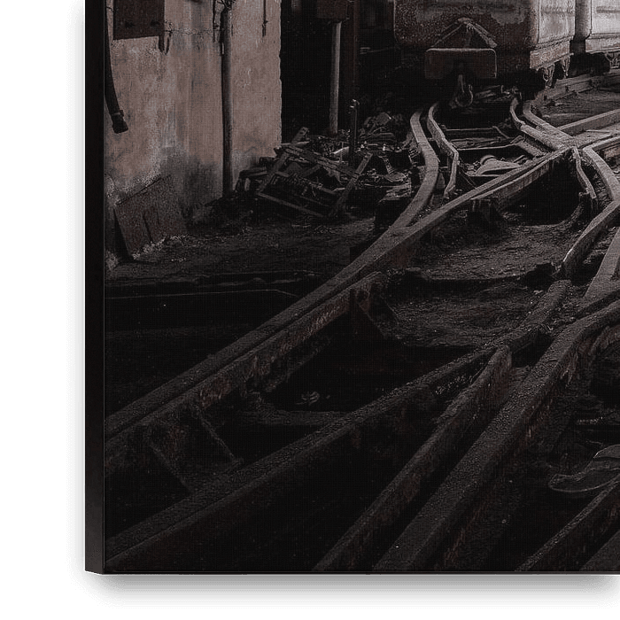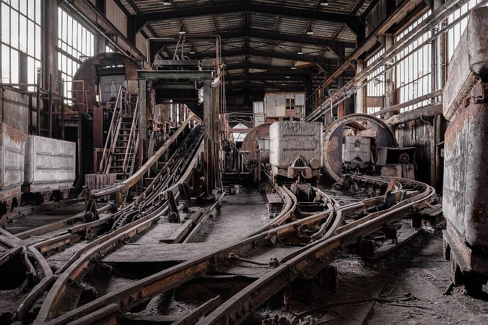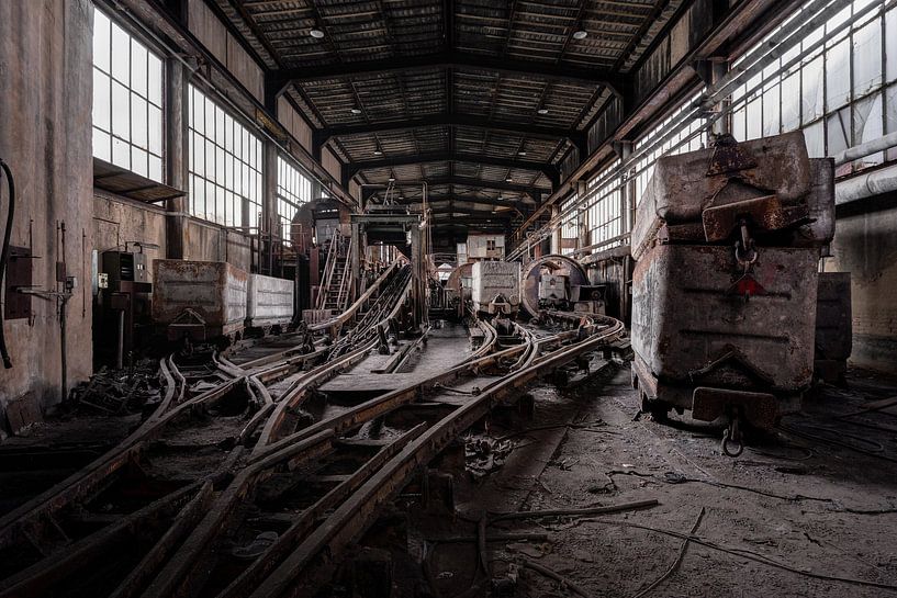 The last rays of the summer evening sun tickle the rusty trolleys of this mine in France, which ceased operations many years ago. Rails wind their way through the room, everything is marked by heavy corrosion. A thick layer of black dust covers the floor and emphasises the raw, gloomy atmosphere.