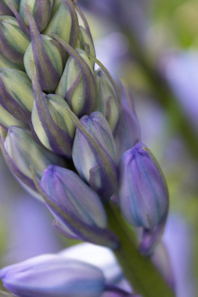 In this photo, you see a hyacinth in early bloom, with dense, purple buds slowly opening. Look closely, and you'll see subtle shades of green among the petals—a detail that reveals the transition from bud to bloom.