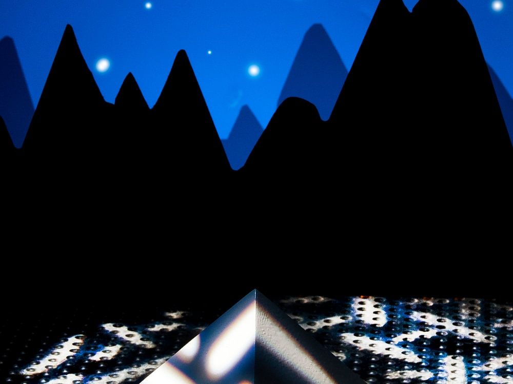 A floating pyramid shone with mottled light in a dark setting of mountains with a starry sky and sky object above. Photographed in studio.