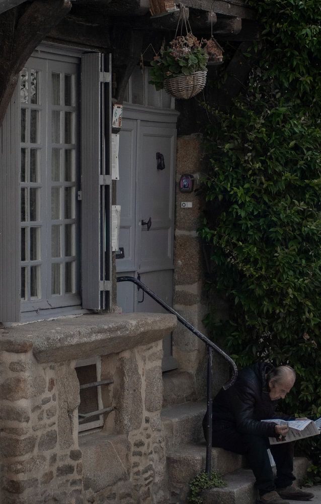 old man sits on the stairs reading the newspaper on a street in Dinan, France.