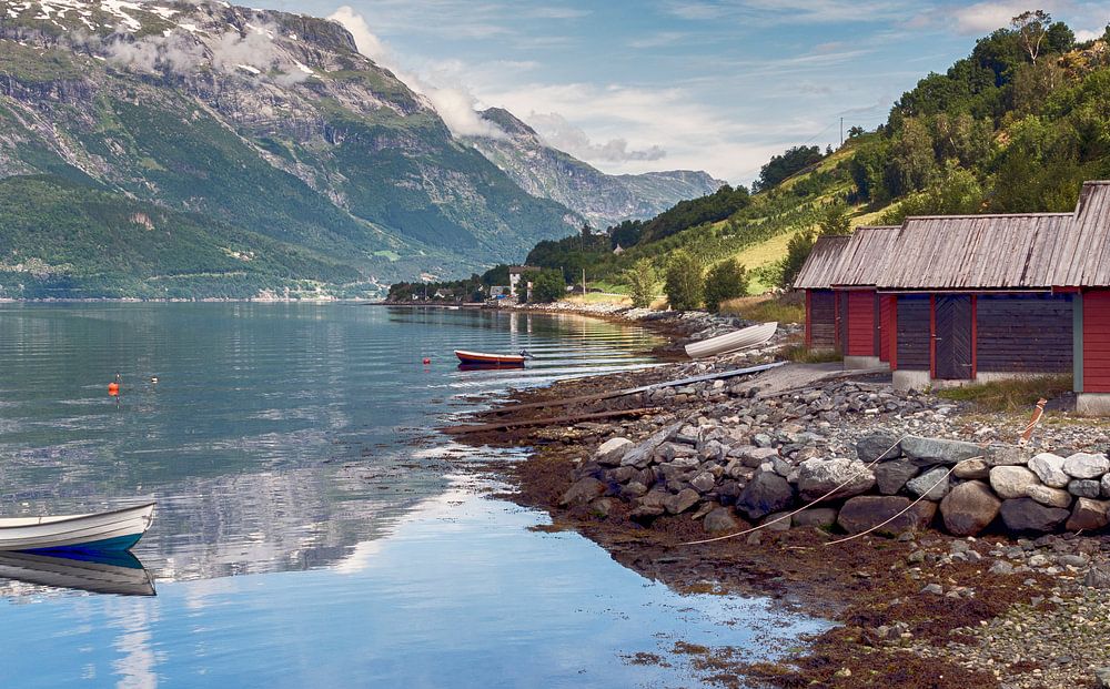 red houses and a boat in the fjord in norway by ChrisWillemsen