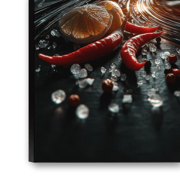 Centraal in de afbeelding zie je vurige rode pepers, robuuste tenen knoflook en frisse partjes limoen – producten die symbool staan voor intensiteit, versheid en karakter.