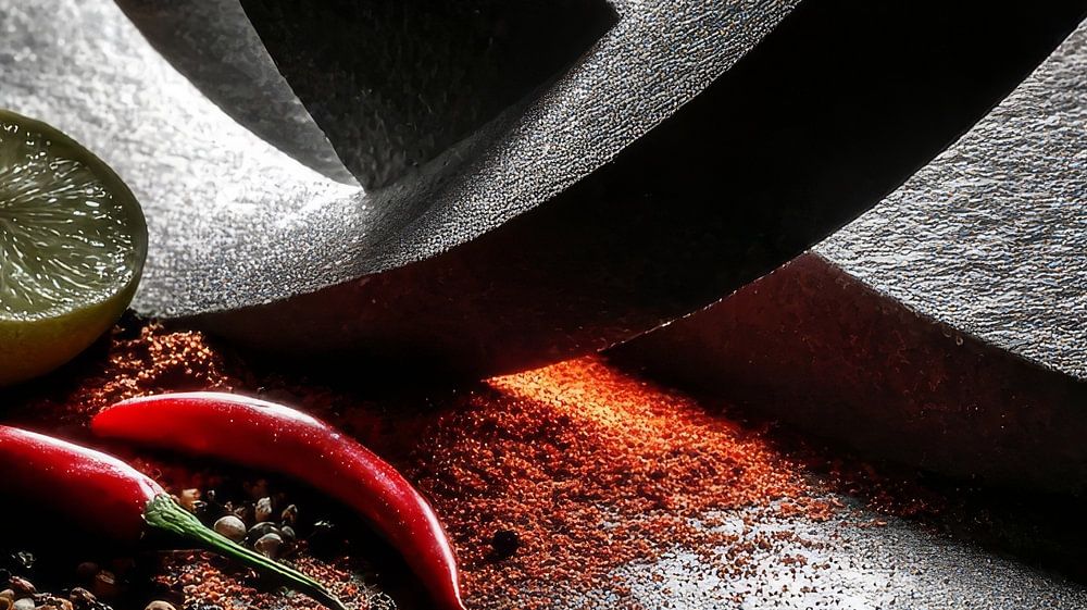 Centraal in de afbeelding zie je vurige rode pepers, robuuste tenen knoflook en frisse partjes limoen – producten die symbool staan voor intensiteit, versheid en karakter.