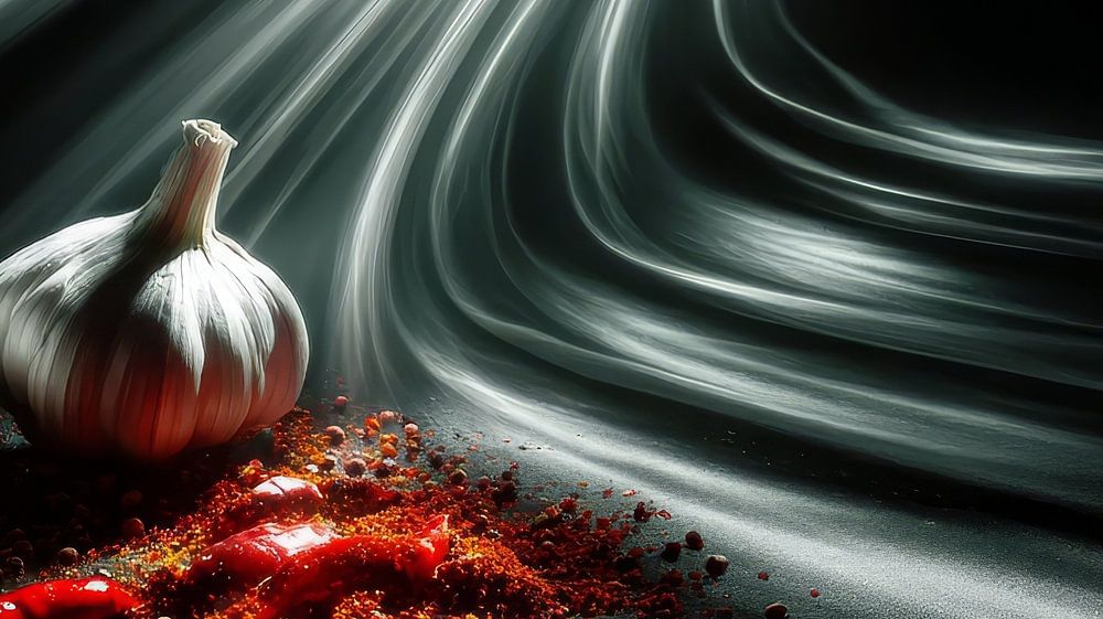 Centraal in de afbeelding zie je vurige rode pepers, robuuste tenen knoflook en frisse partjes limoen – producten die symbool staan voor intensiteit, versheid en karakter.
