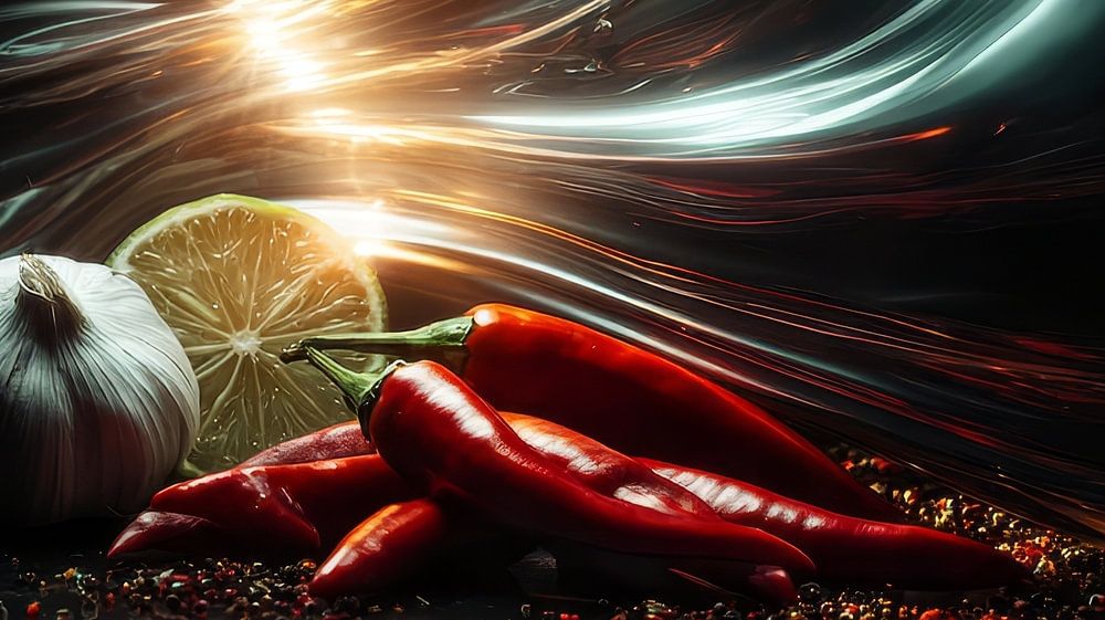 Centraal in de afbeelding zie je vurige rode pepers, robuuste tenen knoflook en frisse partjes limoen – producten die symbool staan voor intensiteit, versheid en karakter.