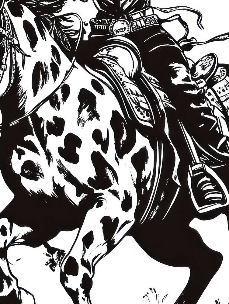This black and white cartoon artwork shows a young cowgirl in action, galloping on a dotted horse through a desert landscape full of cacti. The style is a playful mix of pop art and cartoon drawing, with bold lines and contrasting patterns giving it a dynamic look. The cowgirl wears a bow blouse that flaps in the wind as she races across the dusty ground. Her tight leather trousers add a tough, adventurous flair to her outfit.