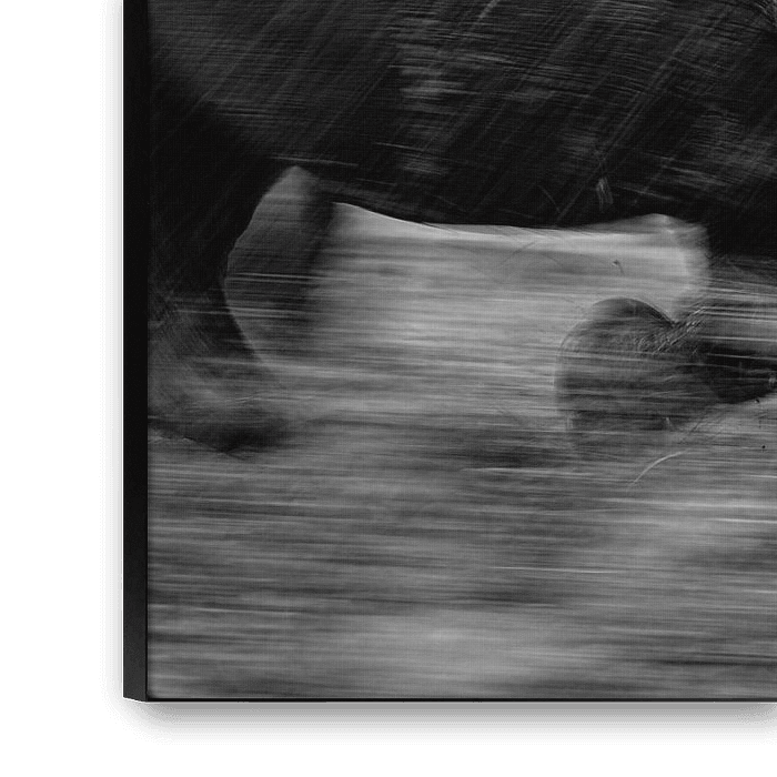 rhino in the pouring rain, photographed with a slow shutter speed in the kruger national park and executed in black and white.