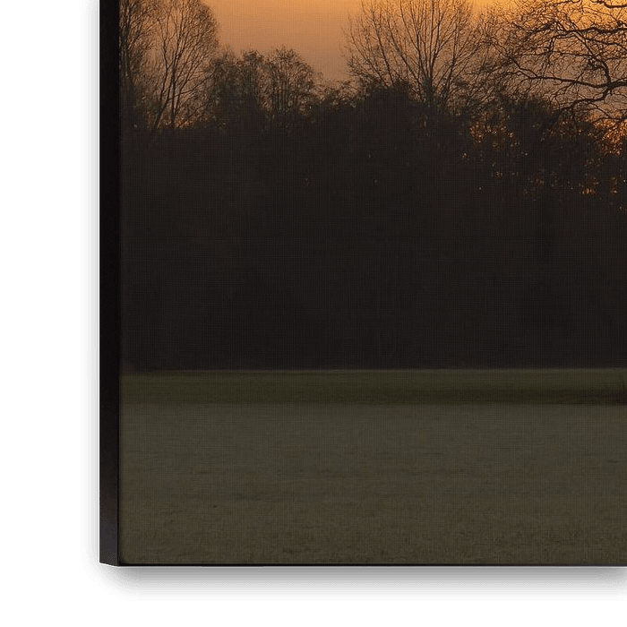 landscape in Vorden, early on a cold winter morning, where the rising sun creates an orange sky between the trees