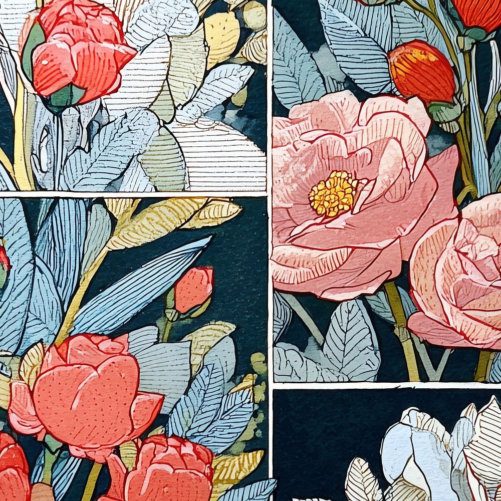 roses and iris flowers illustration, layers template with white contour, gouache and acrylic pen digital imitation