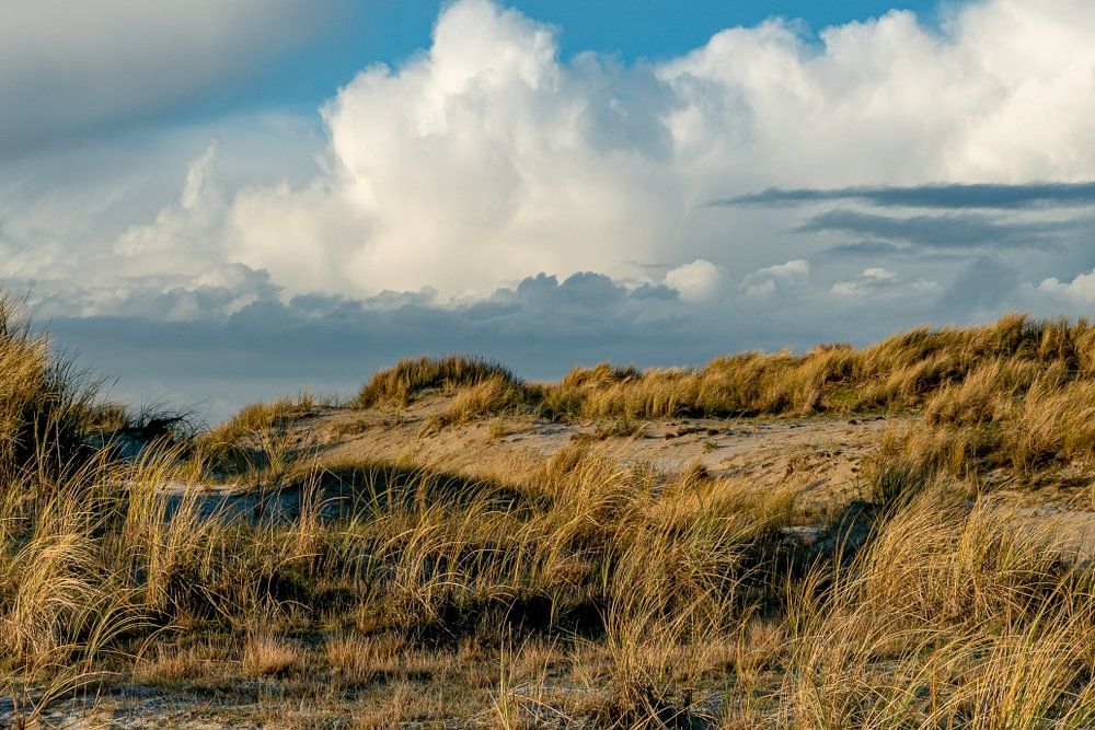 beautiful sand dunes formed by the wind on the beach of the Wadden Island of Texel with the sea and clouds in the background