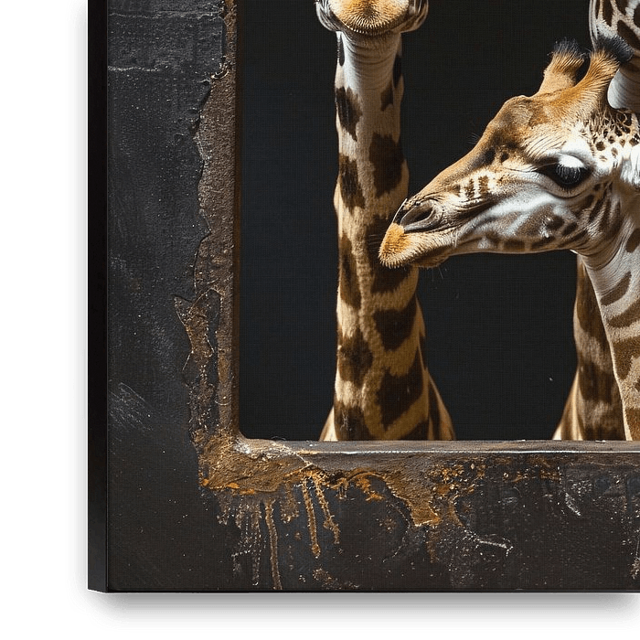 Three curious giraffes poke their heads through a weathered window frame, their soft eyes full of wonder as they explore the world outside their familiar surroundings. The contrast between their mottled fur and the dark window frame creates a sense of mystery and intrigue, leaving the viewer wondering what the giraffes see and what…