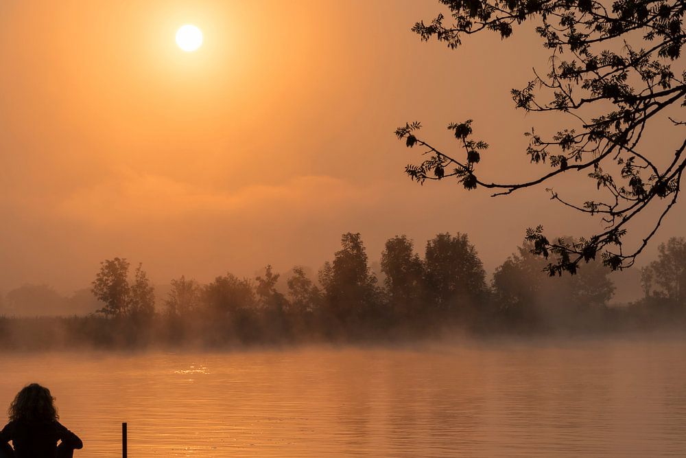 silhouette girl at wooden jetty during sunset in the early morning over the river maas in limburg in holland with the trees mist and hazy fog