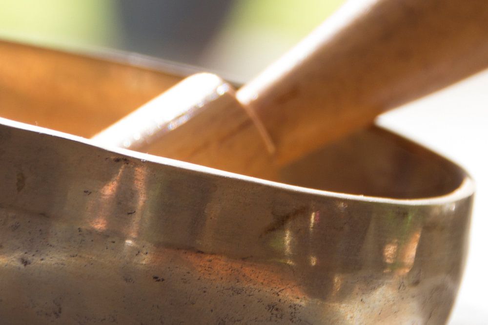 A singing bowl is a musical instrument in the form of a bowl made of an alloy. The various metals, including gold, silver and copper, can differ in size, colour, wall thickness and composition. Source: Wikepedia