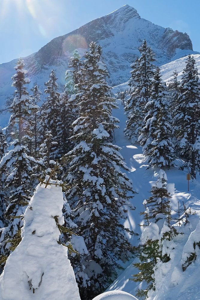 view from skiiing area Kreuzeck Garmisch, to Alpspitze mountain in winter, alpine landscape upper bavaria with bright sunshine
