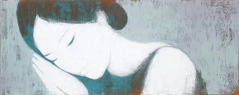 slaapende vrouw | Blue Pause - Dit is een ingetogen vrouw schilderij waarin de hele compositie draait om één gebaar: het hoofd naar voren, de ogen gesloten, de hand zacht tegen het gezicht. Het eerste wat opvalt is de grote, bijna witte vorm van haar gezicht en schouder — als negatieve ruimte die rust uitstraalt. De contouren zijn…