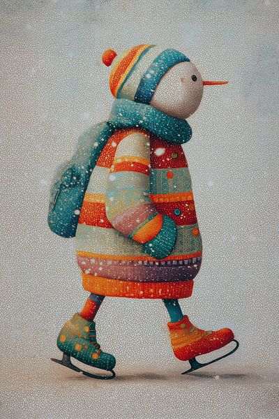 sneeuwpop | Schaatsende Sneeuwpop - Dit is een vrolijk, licht surrealistisch sneeuwpop schilderij waarin twee dingen meteen in je gezicht springen: de ronde, vriendelijke sneeuwpop-figuur en zijn uitbundige, gestreepte winteroutfit met schaatsen. Als kunstenaar koos ik voor een eenvoudige compositie: één personage, in profiel lopend naar rechts, zodat je direct de beweging voelt — alsof je hem hoort piepen over het ijs. In dit sneeuwpop schilderij levert de contour van de bolle kop met het kleine wortelneusje een instant knipoog naar kerst en winter zonder al te zoet te worden.