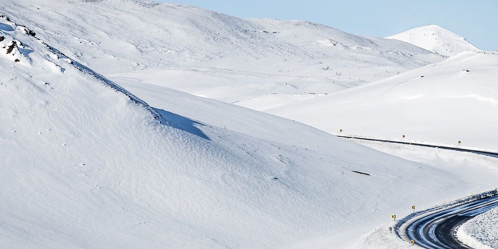 this road , the 1 , winds its way through the Icelandic snow landscape