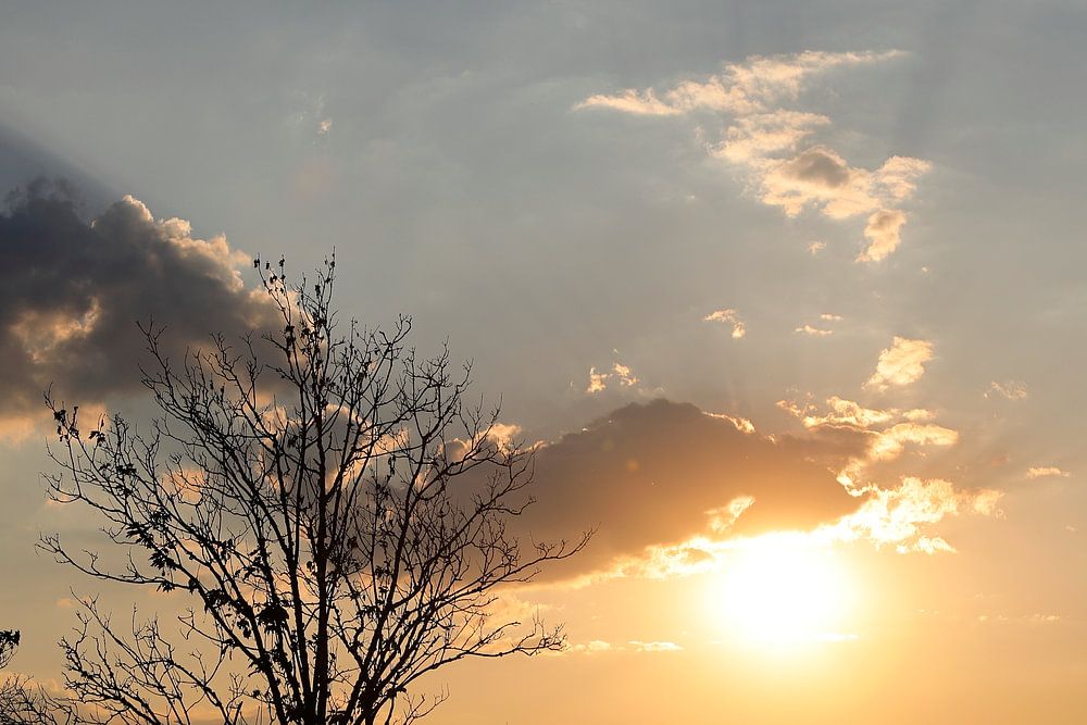 During sunset, very beautiful Sun harps could be seen from a hill near Saarburg in Germany. The blue and golden glow in the sky beautifully contrasted against the silhouettes of the trees and hill. The solar harps from the last rays of the sun were breathtakingly beautiful