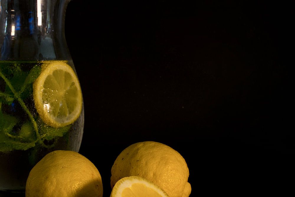 still life with a jug of water filled with mint and lemon with the raw lemon fruit in the foreground