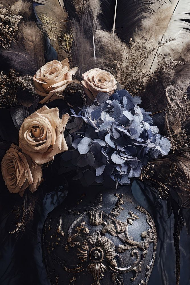 The dried flowers, once so full of life and now a subtle tribute to time, rest like precious treasures in a still life that demonstrates a delicate balance between transience and timeless grace. Each petal seems to tell a story, a memory of opulence and splendour that, though faded, still resonates in the still life's silence.