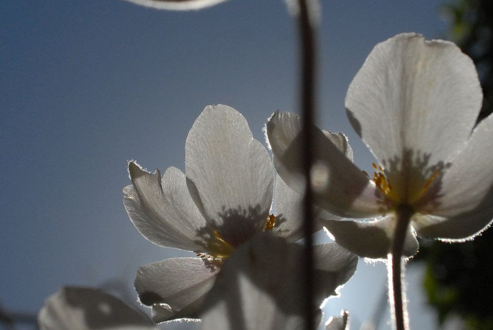 White flowers bathed in sunlight. Because of the backlight the flowers become transparent and the pattern is visible. This light also gives them a beautiful silver lining.