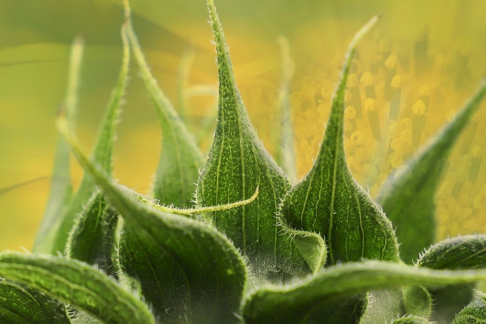 Sunflower in bud with a sunflower in bloom in the background, a lot of depth of field in the photo in the colors yellow and green