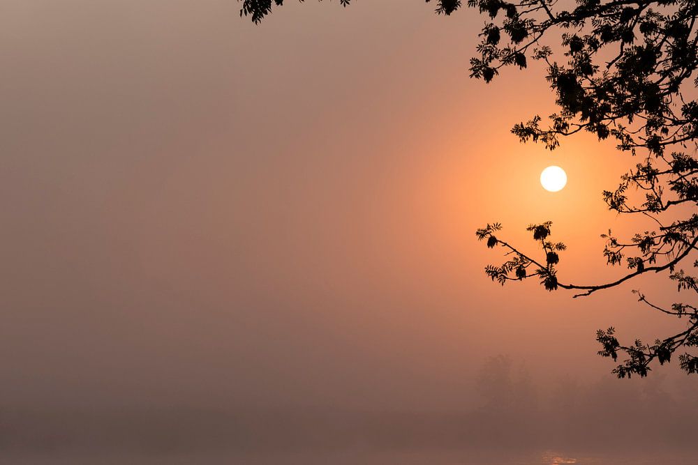sunset in the early morning over the river maas in limburg in holland with the trees mist and hazy fog and wooden jetty as forground