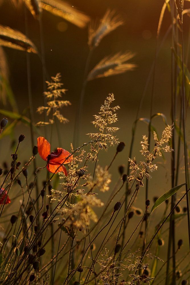 sunset during the golden hour in the meadow with a single poppy among the grain and various grasses with beautiful backlighting.
