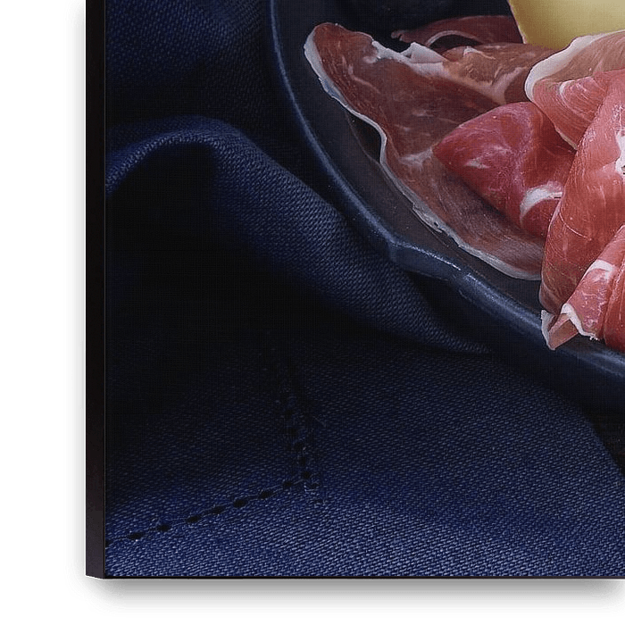 Buy the photo supper plate with various cheese, air dried ham, blue grapes and bread on dark rustic wood, selected by Maren Winter on canvas, ArtFrame, poster and wallpaper, printed on demand in high quality.