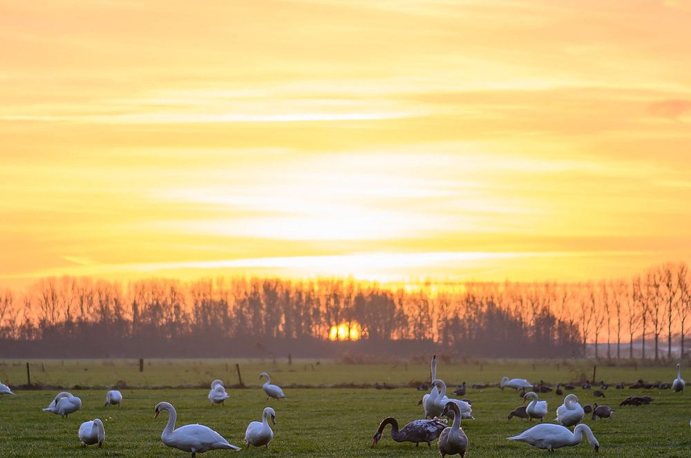landscape in Randwijk, Gelderland, where a large group of swans is eating on a meadow while the sun rises in the background