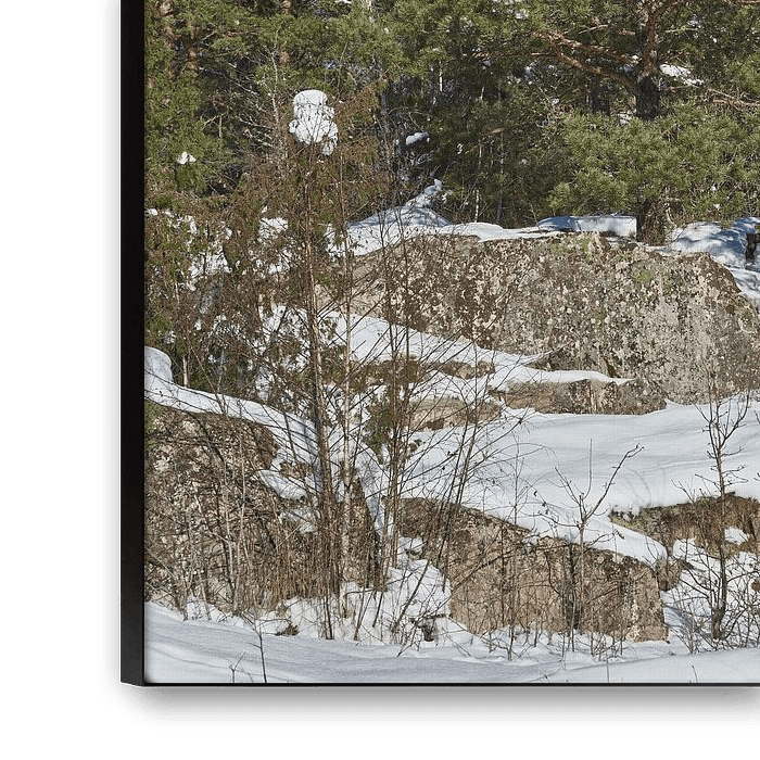 Typical Swedish landscape in winter there is snow pine trees and granite rocks further a blue sky on the outskirts of Blanka