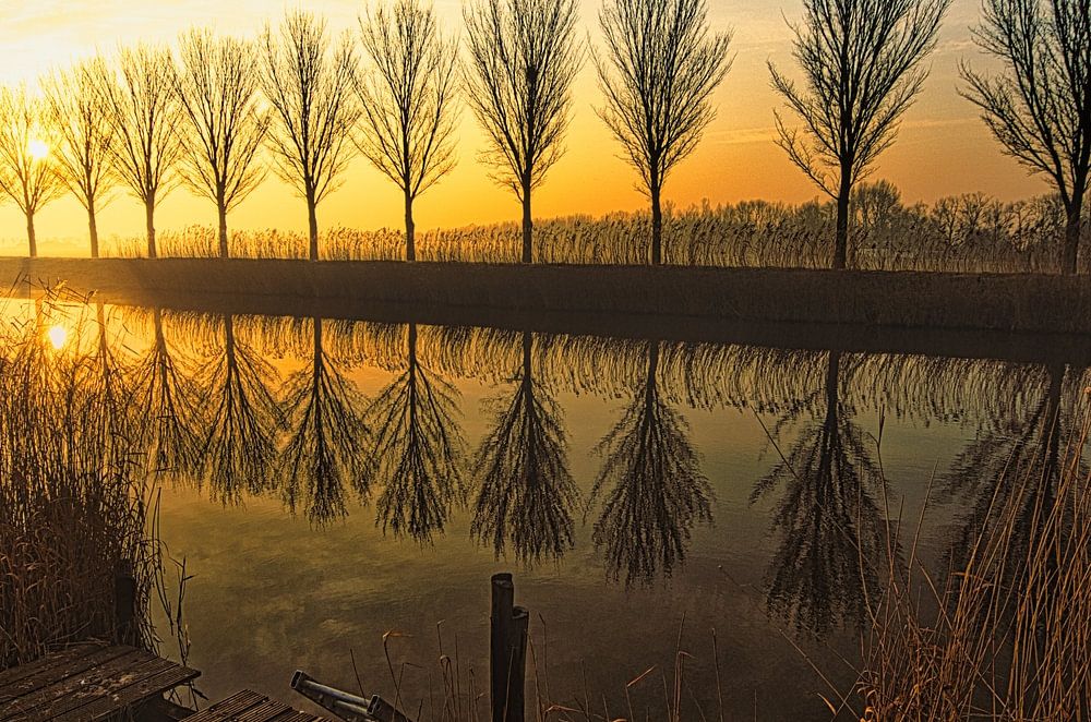 After the misty sunrise we cycled further into the polder , the Beemster. And then when the sun starts to break through a little you get those sun harps. The polder is characterised by tight rows of trees, small bridges and ring canals.