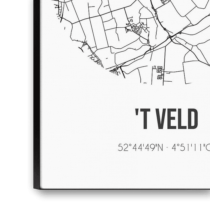 Black and white map, street map or street plan of 't Veld. 't Veld is located in the municipality of Hollands Kroon, province of North Holland. On the city map all public roads in 't Veld are included. Furthermore, the map is provided with the coordinates of the center of 't Veld.