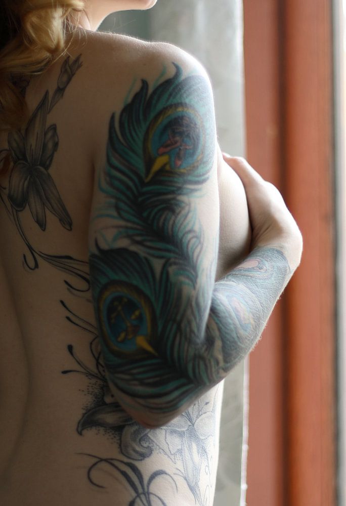 Tattoos: Tattoos are visible on the woman's back and arm. One of the tattoos resembles a peacock feather.