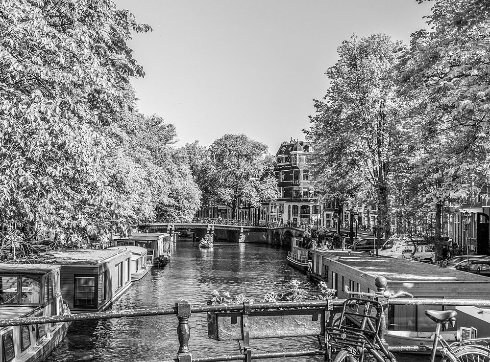 View over the Brouwersgracht from a bridge with bicycles black and white
